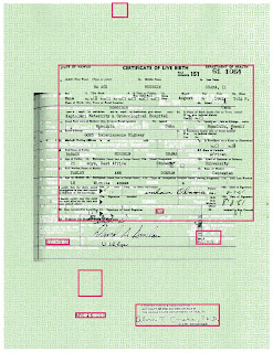 Here's a look at the form, with all the elements outlined in bright red and with the Certificate of Live Birth form offset on the background. Click on it for a full-size version.
